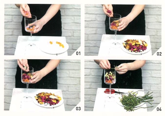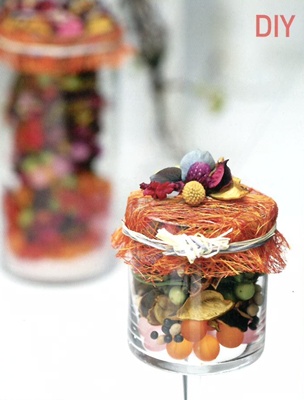 02. 은은한 향이 퍼질 수 있도록 방향성을 가진 붉은색 노란색 포푸리 잎사귀를 넣는다.