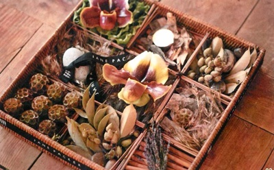꽃과 함께 밤이나 솔방울,수수등 가을에 흔히 볼 수 있는 아이템을