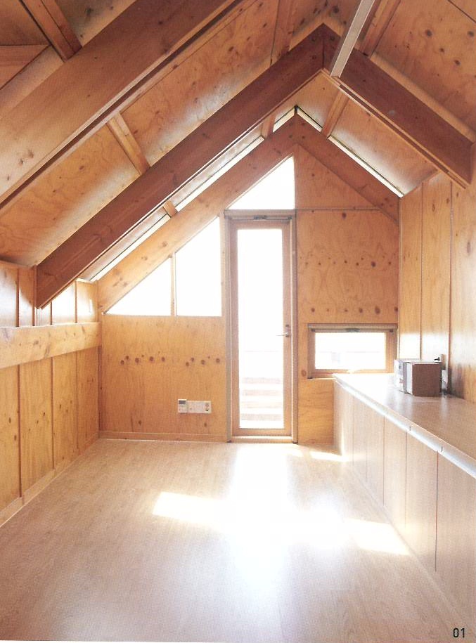 지붕 골조를 그대로 노출시켜 개성 넘치는 다락방이 되었다. 루버 일색으로 마감한 여타 다락방과는 느낌이 사뭇 다르다. 다락방에서 외부로 통할 수 있게 한 점도 눈길을 끈다.