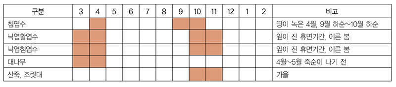>이 시기에도 내한성이 약한 수목이나 화초는 지역성에 따라 서리와 냉해 피해를 입을 수 있다. 수피를 싸주거나 온실이나 실내로 들여놔야 한다.