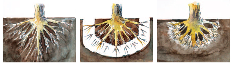 >>> ① 뿌리돌림 전의 모습 ② 뿌리 주변 파내고 정리하기 >③ 뿌리돌림 후 잔뿌리 발달