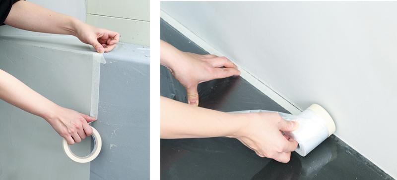 >01 >벽면에 프라이머가 묻으면 막이 형성되어 자국이 남을 수 있다>. >마스킹테이프를 벽면 모서리나 시공 면 끝자락에 붙인다>. >바닥에는 비닐이 붙어 있는 커버링테이프>(>보양테이프>)>를 붙여 미장재료로 바닥이 오염되는 것을 방지한다>.