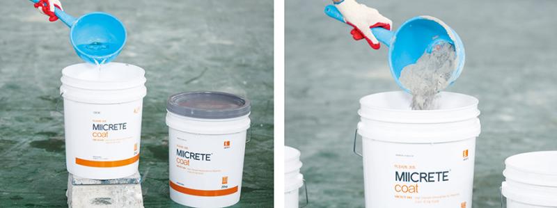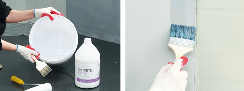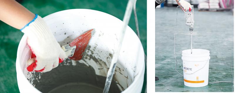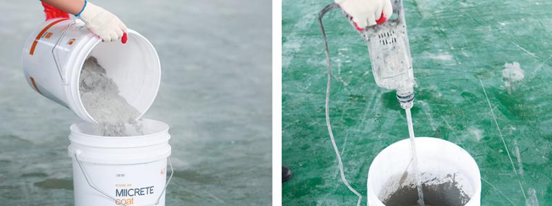 04> >프라이머가 건조될 동안 모르타르를 준비한다>. >콘크리트와 물을 믹싱할 때 배합 비율에 따라 색상 차이가 날 수 있다>. >매뉴얼을 참고해 정확한 비율로 믹싱해야 한다>. >모르타르가 건조할 수 있으니 콘크리트는 >5>㎏ >단위로 섞어서 쓰는 것이 좋다>.