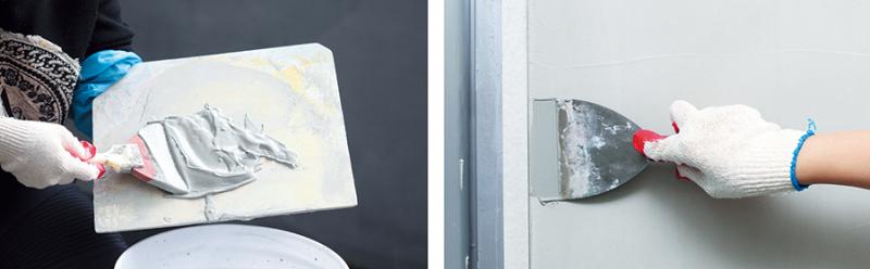 07> >충분히 혼합된 모르타르는 미장판에 적당량씩 덜어 사용한다>. >치약보다는 약간 묽은 생크림 정도의 점성이면 좋다>. >철 스크래퍼>(>철 헤라>)>를 이용해 모서리 면부터 작업한다>.
