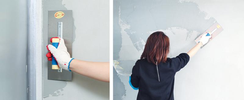 >다양한 바탕면>(>미장>, >석고보드>, >합판 등>)>에 시공이 가능한 마감재로 흰색>, >회색 가루 형태로 물과 섞어 사용한다>. 20>㎏>이 한 포로>, 0.6>㎜ >두께로 시공 시 >20>㎡>(6~7>평>)>을 바를 수 있다>.