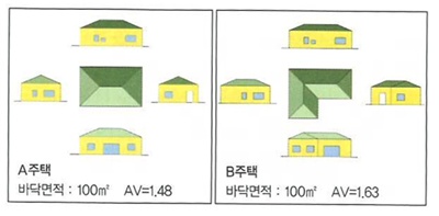 또한 외벽면적의 차이(AV값)로 인해 C주택 대비 B주택의