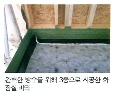 화장실은 대부분 구조재로 제작하고 우레탄 방수를 한 뒤에 타일을 붙인다.