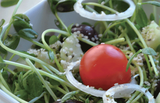 맛 & 응용요리 쌉쌀한 맛이 좋다. 다양한 새싹의 종류가 있는 만큼 활용도가 높다. 새싹 비빔밥, 새싹 샐러드 등의 요리를 할 수 있다.