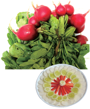 맛 & 응용요리 귀여운 모양의 래디쉬는 톡 쏘는 맛과 함께 수분감도 강하고 달큰하다. 순무 맛과 유사하다. 물김치나 겉절이, 피클로 담궈서 두고 먹어도 좋다.